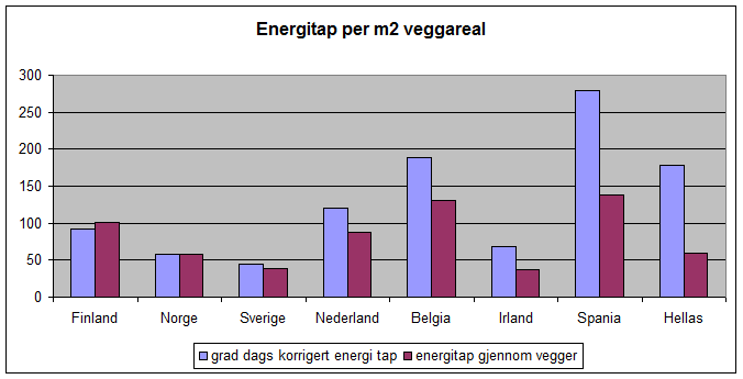 Av og til kommer det fortsatt kritikk, både fra norsk og utenlandsk hold, om at vi sløser med energien i Norge. Men vi skal nå ha det levelig der vi lever. Og kanskje har vi innrettet oss rimelig fornuftig etter forholdene. Antall graddager (18 oC – middeltemperatur ute) er et godt mål på hvilke klimatiske forhold vi må tilpasse oss. Figur 1 viser graddagstallet for et utvalg europeiske land. Med samme isolasjonstykkelse vil det kreve 3 ganger så mye energi å varme opp et hus i Norge som i Hellas.