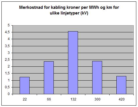 Figuren viser merkostnad for kabling i kroner per MWh for hver km linje som kables istedenfor luftlinje. Anslagene er i all hovedsak basert på kostnader presentert i NOU 1998:11 Energi- og kraftbalansen mot 2020.