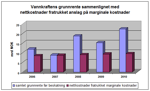 Økt kraftpris øker grunnrenten. I 2010 innkasserte Finansdepartementet 6,7 milliarder kroner i grunnrenteskatt. 30 prosent grunnrenteskatt og en markedspris i området 30 – 35 øre/kWh gir en årlig grunnrente i området 15 – 20 milliarder kroner. Nettleien på distribusjonsleddet nærmer seg 15 milliarder kroner, marginale kostnader utgjør grovt regnet halvparten.