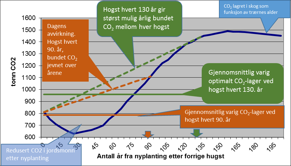 Figuren illustrerer hvordan tidspunkt for avvirkning av skog påvirker både gjennomsnittlig årlig opptak av CO2 mellom nyplanting og hogst og størrelsen på det gjennomsnittlige lager av CO2 for en skog som blir avvirket ved henholdsvis 90 og 130 års alder.